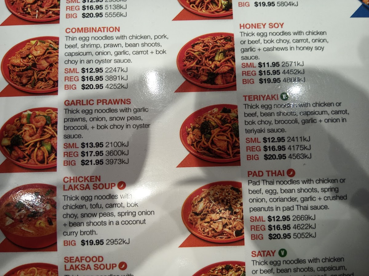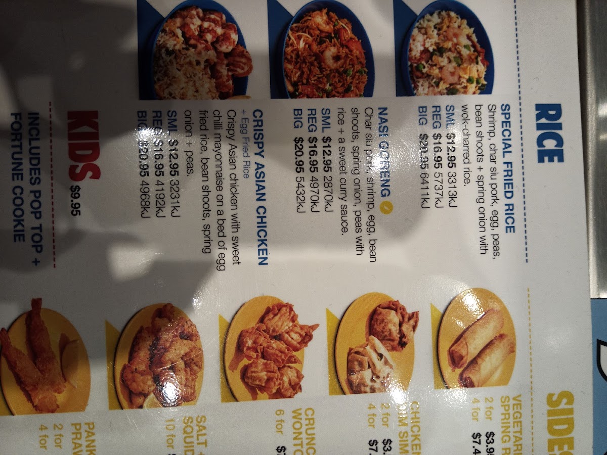 From a reviewer’s perspective, the menu at Noodle Box Stratton offers a diverse range that caters to both traditional and adventurous tastes. The Crispy Chicken & Rice section impresses with options like Golden Curry Katsu Chicken (2840 KJ), Chinese Sweet & Sour Pork Belly (3424 KJ), and Firecracker Chicken W/ Egg Fried Rice (2853 KJ), alongside lighter choices such as Japanese Chicken (2318 KJ) and the ever-popular Chinese Special Fried Rice (1854 KJ). For those seeking flexible portions, the Value Range features Value For Two, Family Value, Value For One Large Delivery Bowl, and Value For One Standard Delivery Box. Soups are hearty and flavorful, from the Seafood Malaysian Coconut Laksa (2343 KJ) to Chicken Malaysian Coconut Laksa (2904 KJ), with vegetarian options like Tofu Malaysian Coconut Laksa (2502 KJ). The Street Sides and Desserts provide tempting additions: BBQ Buns (4pc) (1139 KJ), Salt & Pepper Squid (10 Pieces) (797 KJ), Veggie Spring Rolls (4pc) (1788 KJ), and sweet treats like Sweet Apple Spring Roll (4pc) (880 KJ) and Vanilla Custard Bites (990 KJ). Vegetarian diners are well catered for with dishes such as KFT - Korean Fried Coated Tofu (Soy Protein) (3335 KJ), Vegetarian Pad Thai (2887 KJ), Vegetarian Fragrant Mongolian (3518 KJ), Chinese Vegetable Fried Rice (2614 KJ), and Vegetarian Chinese Combination (2607 KJ). The Wok-Charred Noodles section features flavorsome options including Chinese Combination (2446 KJ), Fragrant Mongolian (3320 KJ), Chinese Honey Soy (2706 KJ), Japanese Teriyaki (2608 KJ), and Pad Thai (2643 KJ), ensuring something for every palate. Complementing the meals, the drinks menu includes Water 600mL, Pepsi 450mL, Small Soft Drink, Spring Valley Juice 300mL, and Soft Drink 1.25L, while cutlery options like Chopsticks and Fork make the dining experience seamless. Overall, Noodle Box Stratton balances classic comfort dishes with bold, modern flavors, providing a menu that satisfies both individual cravings and group orders.